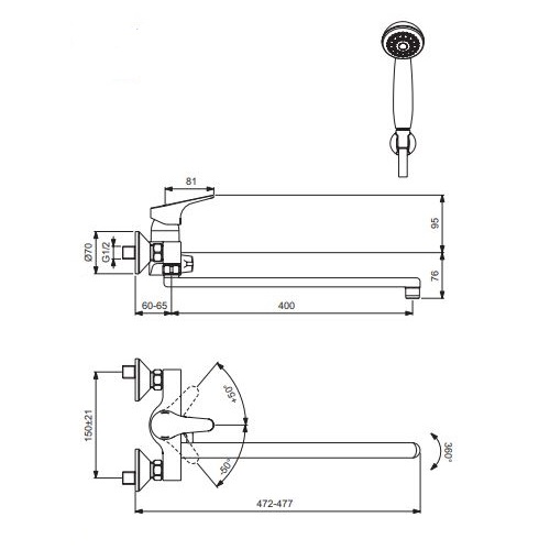 Переключение ванна/душ: ручное (позволяет использовать функцию “душ” даже при очень низком давлении воды)