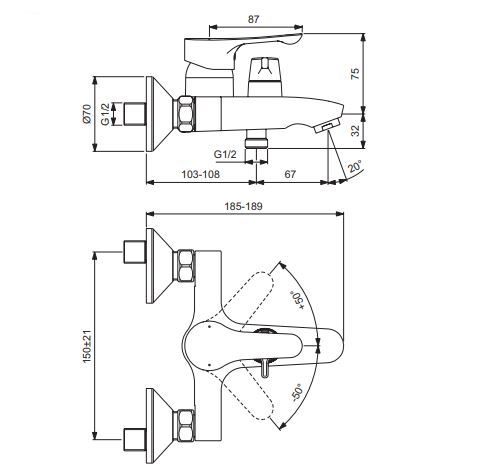 Переключение ванна/душ: ручное (позволяет использовать функцию “душ” даже при очень низком давлении воды)